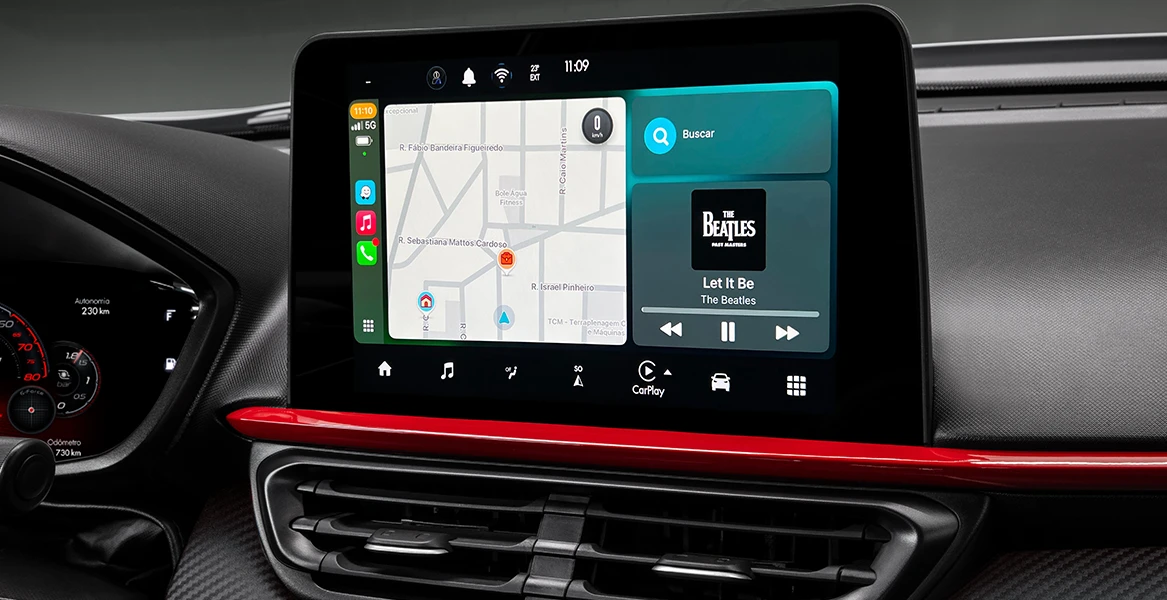 • Central multimídia com tela de 10,1" touchscreen, Apple Car Play e Android Auto wireless, Comandos de Voz, Bluetooth, MP3, Rádio AM/FM, Entrada Auxiliar, Porta USB (2): USB Tipo A e Tipo C.